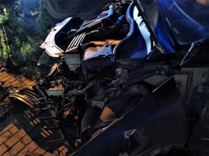 Tyle zostało z samochodu który uderzył w ogrodzenie latarnie